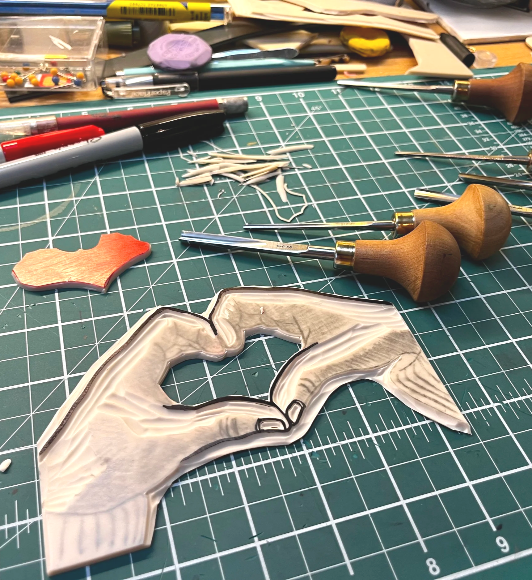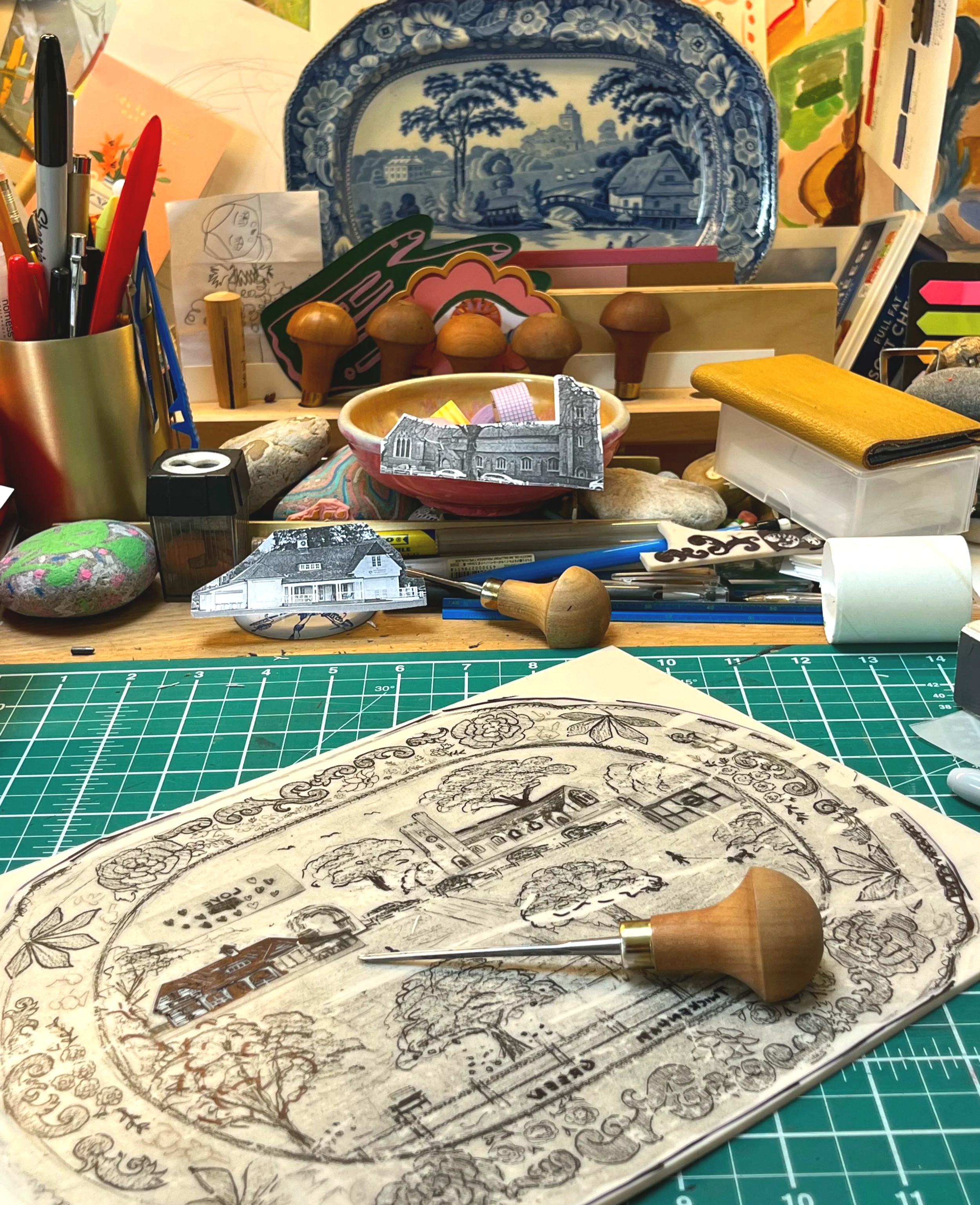 Working from her home studio, which doubles as the family dining area, she embraces the tactile, hands-on process of traditional printmaking. A dedicated mother and artist, Caroline finds joy in sharing her craft by regularly hosting small, popular print workshops in her home.